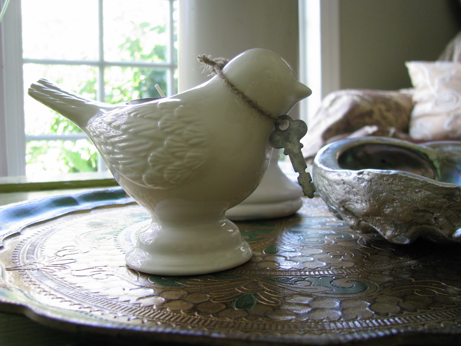 Then I finished the setting with a little ceramic bird candle holder,